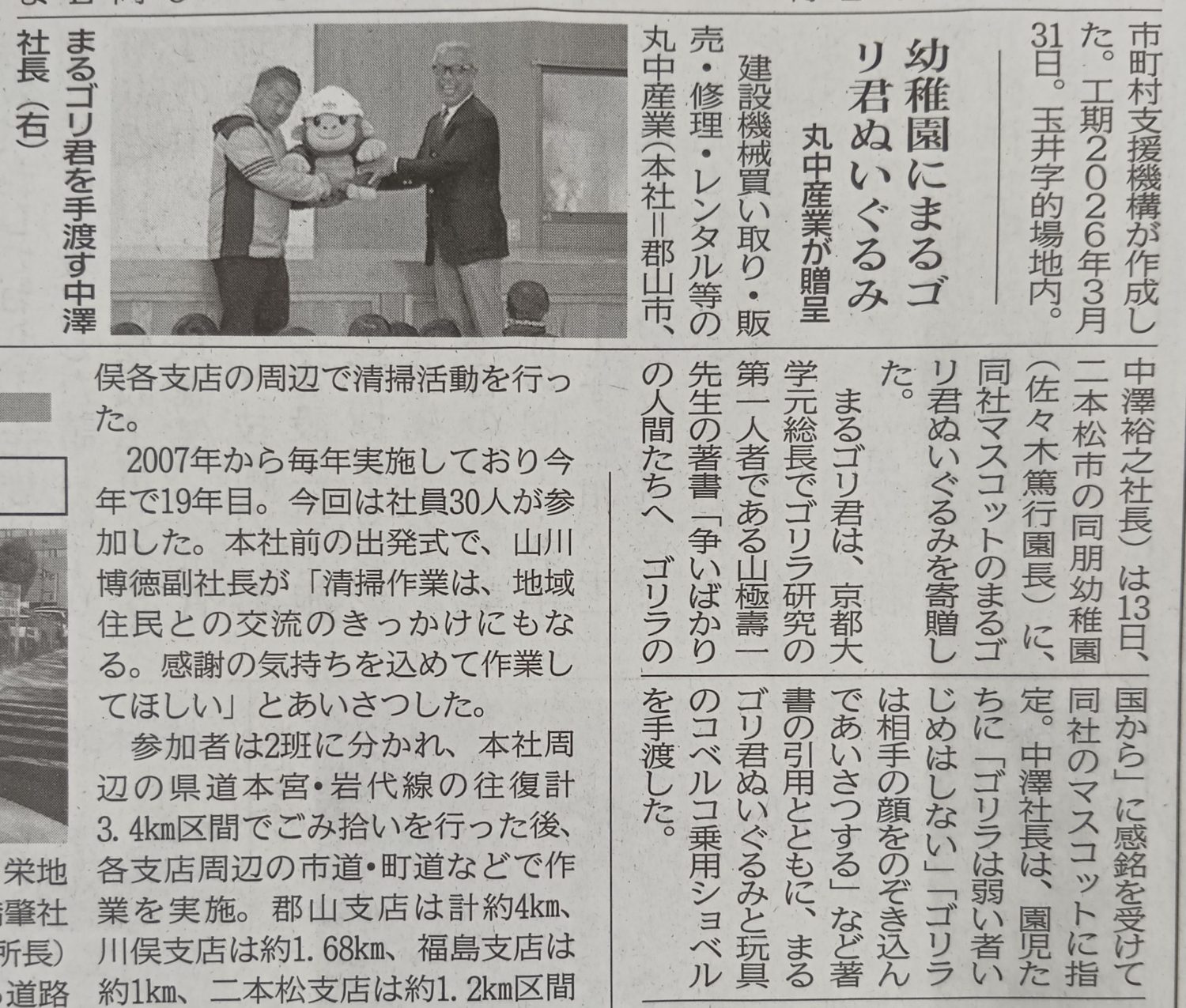 先日、二本松の同朋幼稚園での【まるゴリ君ぬいぐるみ贈呈式】の記事が福島建設工業新聞に掲載されました ありがとうございました🦍🤝